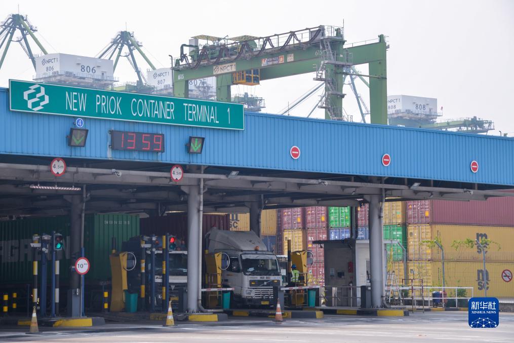 在印度尼西亞雅加達丹戎不碌港,車(chē)輛駛出集裝箱碼頭(10月3日攝)。