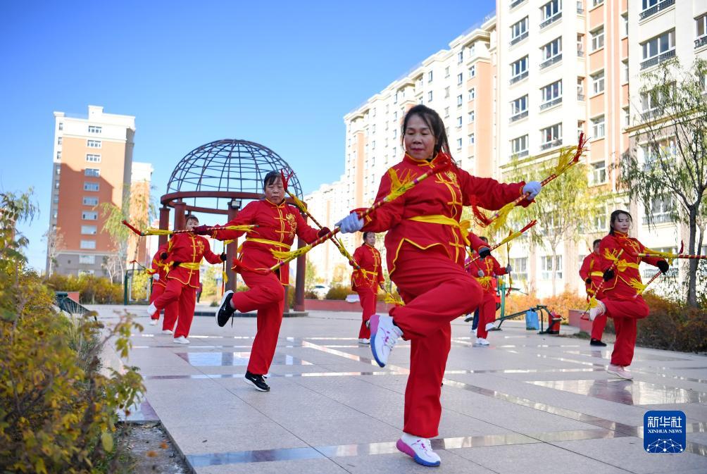 10月13日,河北省康??h怡安康城社區居民在練習康保二人臺霸王鞭。