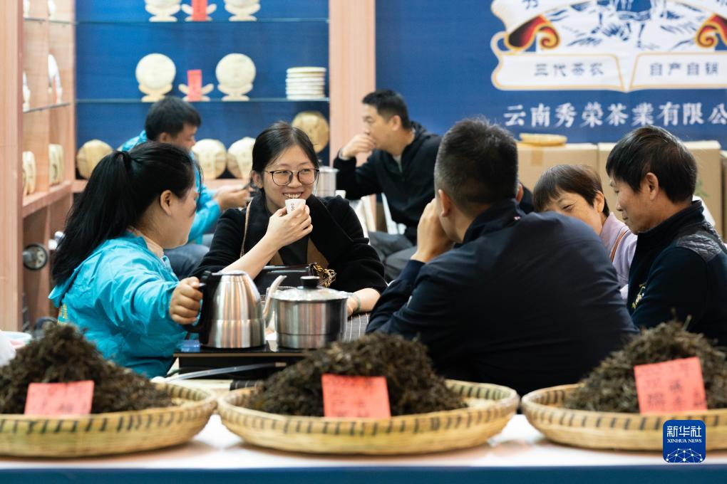 10月14日,參觀(guān)者在第十五屆中國云南普洱茶國際博覽交易會(huì )上品茶。