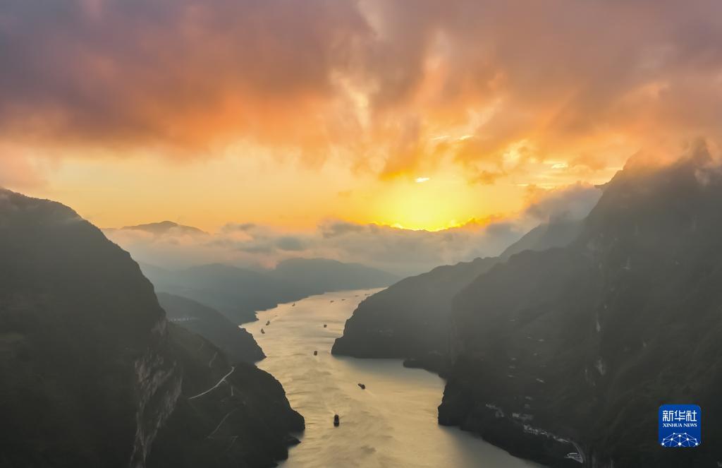 10月8日,船舶行駛在長(cháng)江三峽西陵峽湖北省宜昌市秭歸縣水域(無(wú)人機照片)。