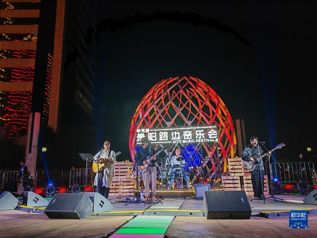 10月14日,樂(lè )隊在貴州省貴陽(yáng)市南明區甲秀廣場(chǎng)舉辦的路邊音樂(lè )會(huì )演出(手機照片)。
