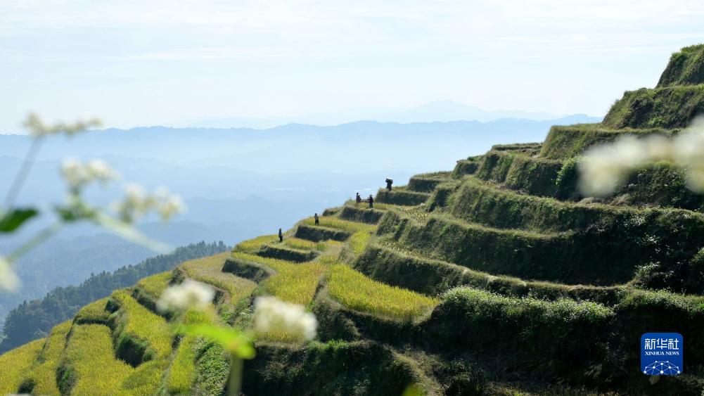 10月14日,在湖南省婁底市新化縣水車(chē)鎮紫鵲界梯田,農民采用人工方式收獲稻谷。