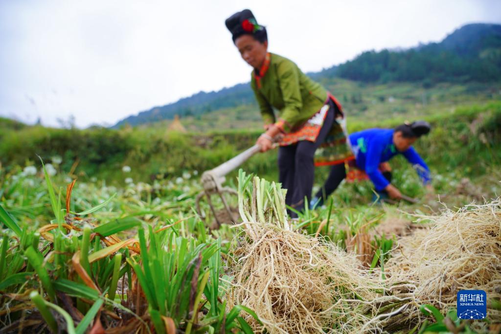 10月13日,村民在貴州省黔東南苗族侗族自治州丹寨縣排調鎮宰宿村韭菜根種植基地采收韭菜根。