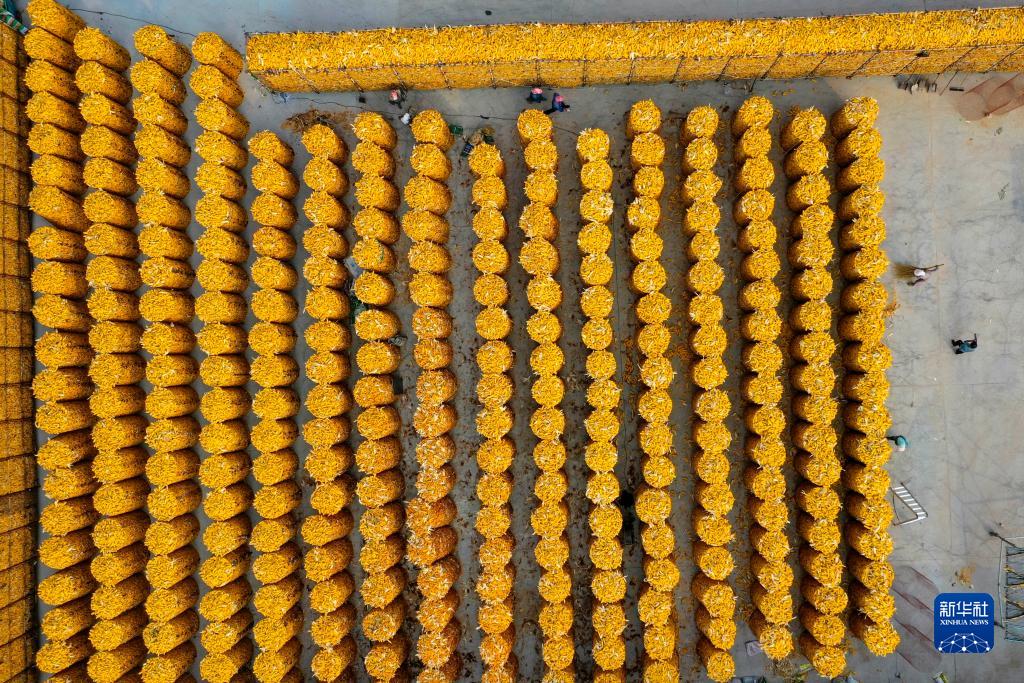 10月13日,在山東省東營(yíng)市廣饒縣李鵲鎮雅文農民種植專(zhuān)業(yè)合作社,農民將收獲的玉米裝網(wǎng)晾曬(無(wú)人機照片)。