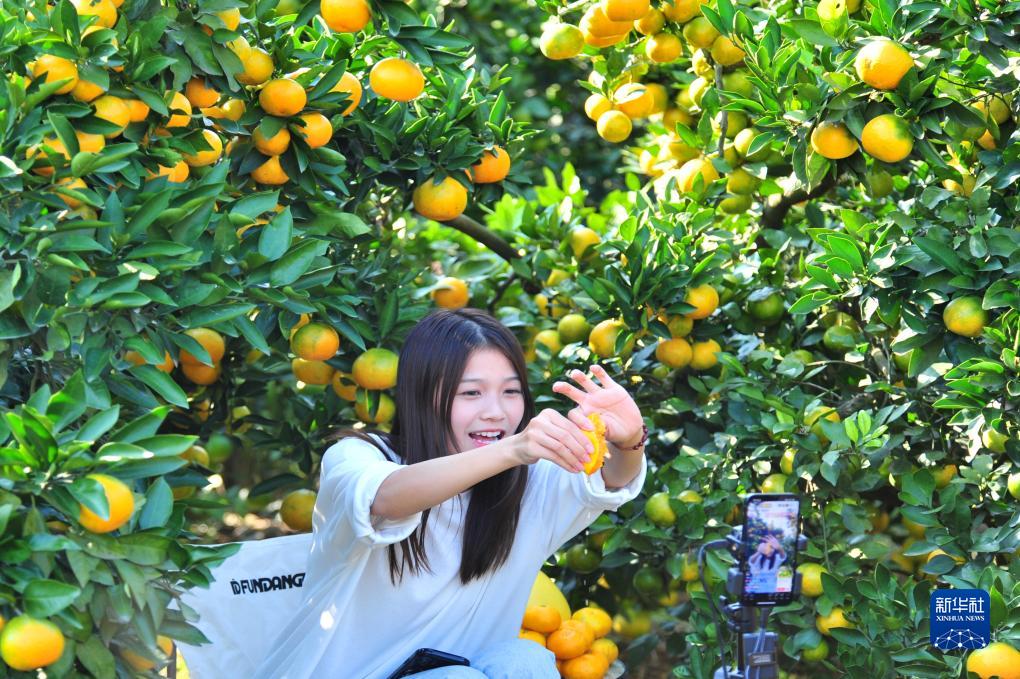 10月14日,農產(chǎn)品帶貨網(wǎng)絡(luò )主播在湖北省宜昌市夷陵區一家生態(tài)橘園向網(wǎng)友推介“夷陵紅”蜜橘。