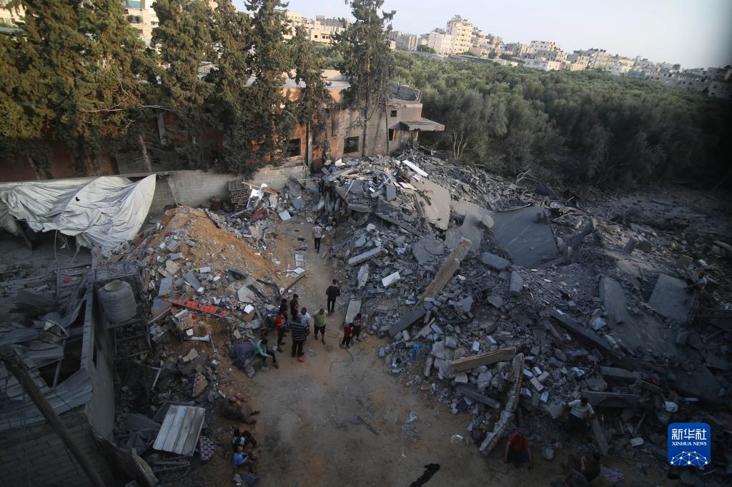 10月14日,在加沙地帶南部城市拉法,人們查看遭以色列空襲炸毀的建筑廢墟。