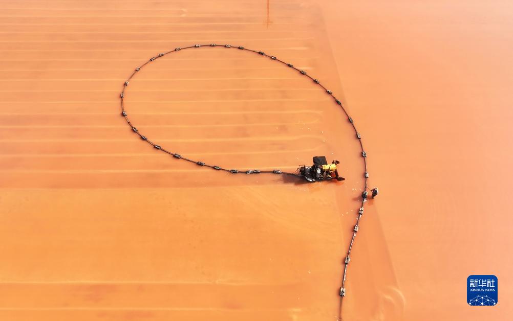 10月14日,工人在河北省灤南縣嘴東經(jīng)濟開(kāi)發(fā)區鹽場(chǎng)收獲秋鹽(無(wú)人機照片)。