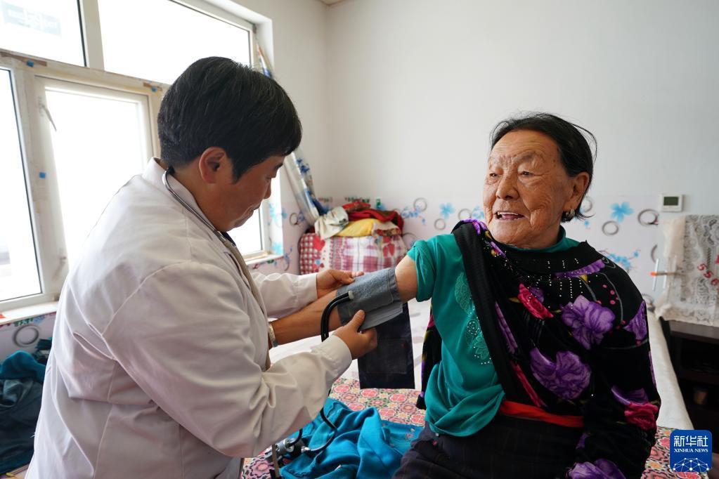 10月14日,醫護人員在河北省康??h土城子鎮互助幸福院內為老人量血壓。