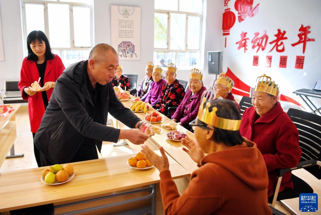 10月14日,河北省康??h土城子鎮互助幸福院的工作人員為過(guò)集體生日的老人們端上生日蛋糕。