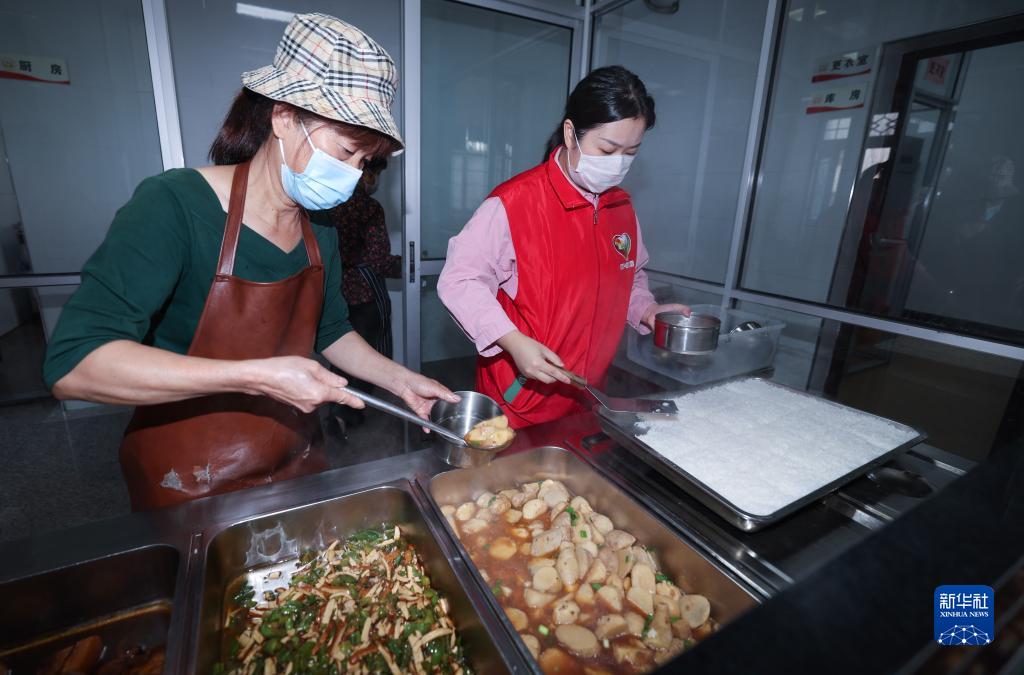 10月15日,在杭州市富陽(yáng)區里山鎮民強村老年食堂,工作人員給老人配餐。