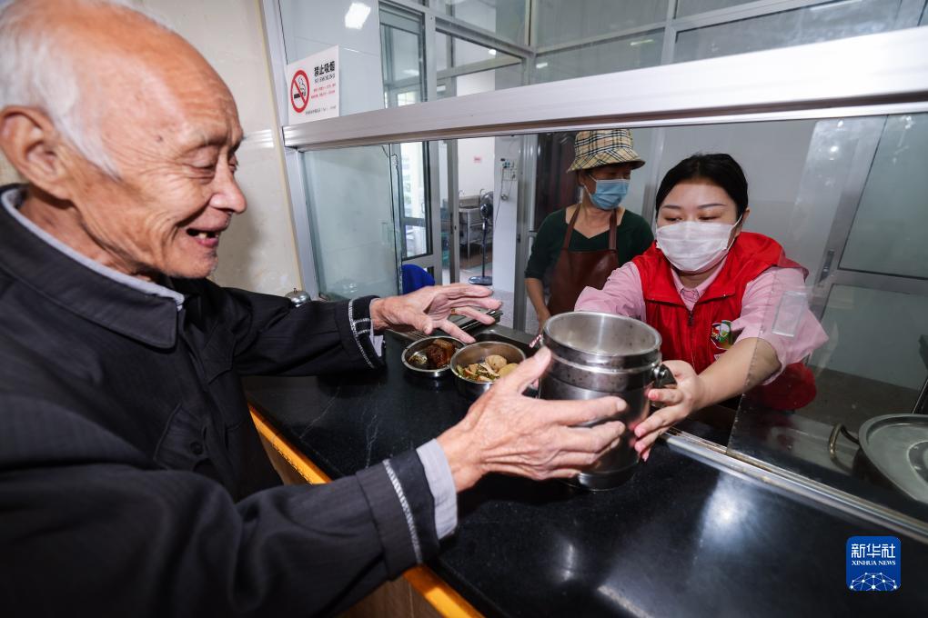10月15日,在杭州市富陽(yáng)區里山鎮民強村老年食堂,黨員志愿者給85歲的老人夏永建(左)配餐。