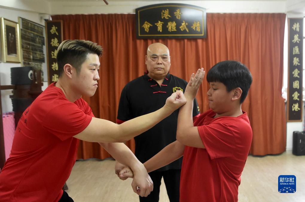 黃耀球(中)指導徒弟練習拳法(8月18日攝)。