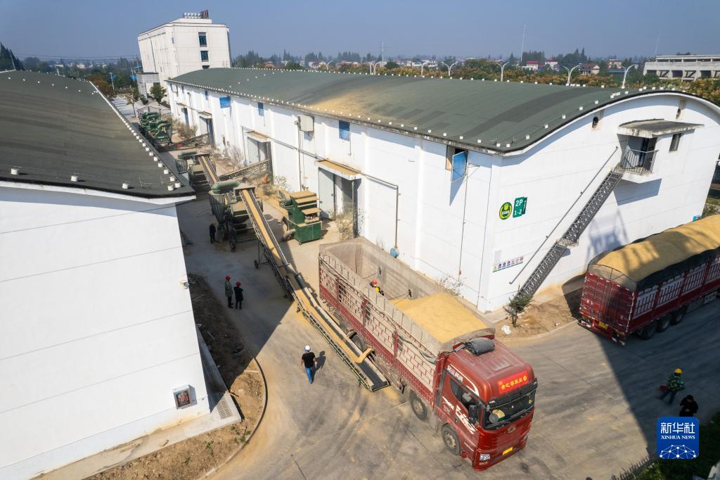10月15日,在南縣南洲橋國家糧食儲備中心,抽樣檢測合格的糧食通過(guò)傳送設備進(jìn)倉入庫(無(wú)人機照片)。