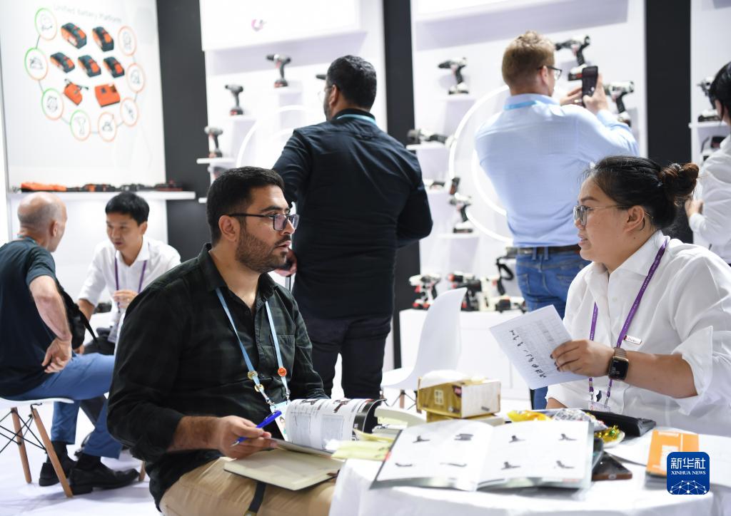 10月15日,在一家電動(dòng)工具展臺,外國采購商在洽談業(yè)務(wù)。
