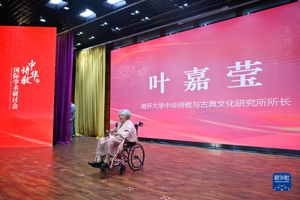 當日,中華詩(shī)教國際學(xué)術(shù)研討會(huì )在天津南開(kāi)大學(xué)開(kāi)幕,來(lái)自中國、美國、加拿大、日本等國家和地區的近200位學(xué)者參會(huì ),共話(huà)中華詩(shī)教的傳承與弘揚。研討會(huì )現場(chǎng),年近百歲高齡的葉嘉瑩先生坐著(zhù)輪椅登臺,講述自己的詩(shī)詞人生與詩(shī)教情懷,并對年輕人送出鼓勵寄語(yǔ)。