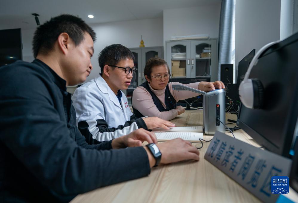 10月15日,云南省圖書(shū)館視障閱覽室工作人員楊云峰(左二)指導兩名視障人士使用紙質(zhì)圖書(shū)智能閱讀器。