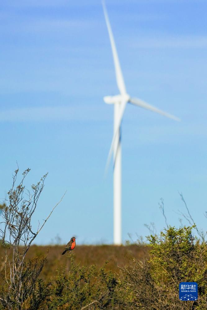 這是6月12日在阿根廷丘布特省馬德林港拍攝的羅馬布蘭卡一期風(fēng)電場(chǎng)。