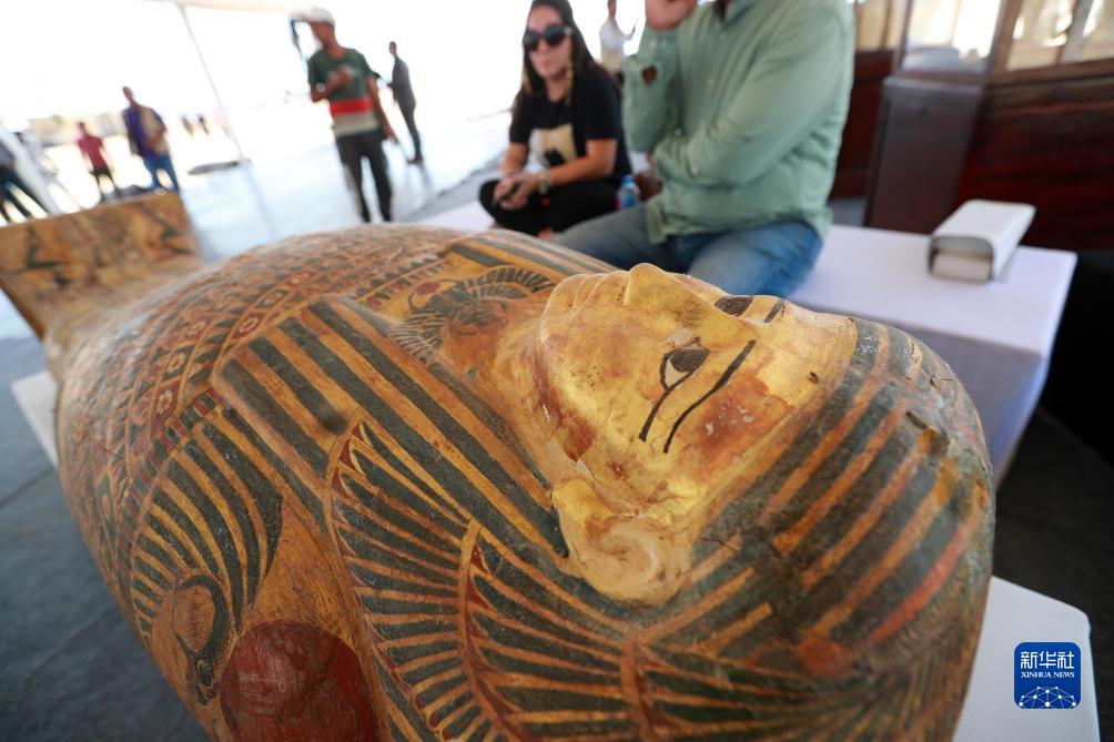 這是10月15日在埃及明亞省考古現場(chǎng)拍攝的彩繪木乃伊棺槨。