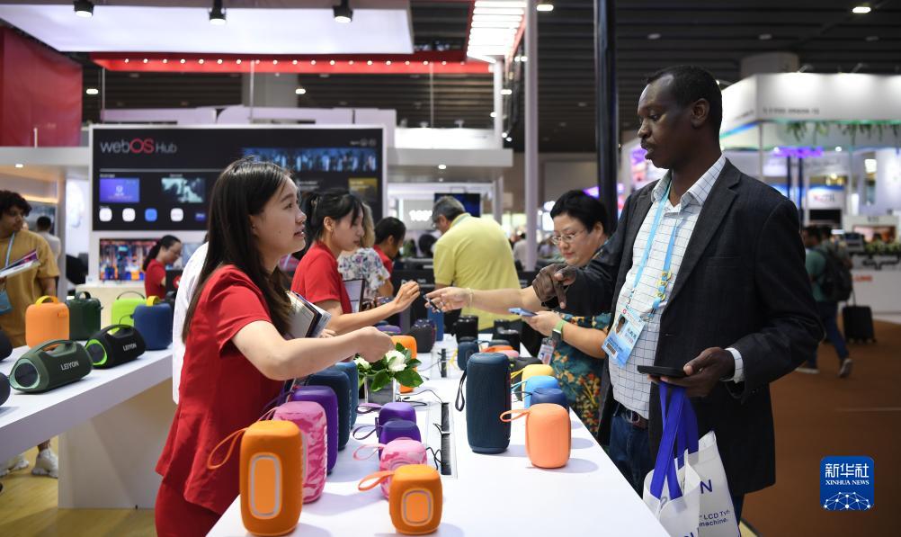 10月15日,在第134屆廣交會(huì )上,來(lái)自蘇丹的客商在智能音箱展臺洽談。