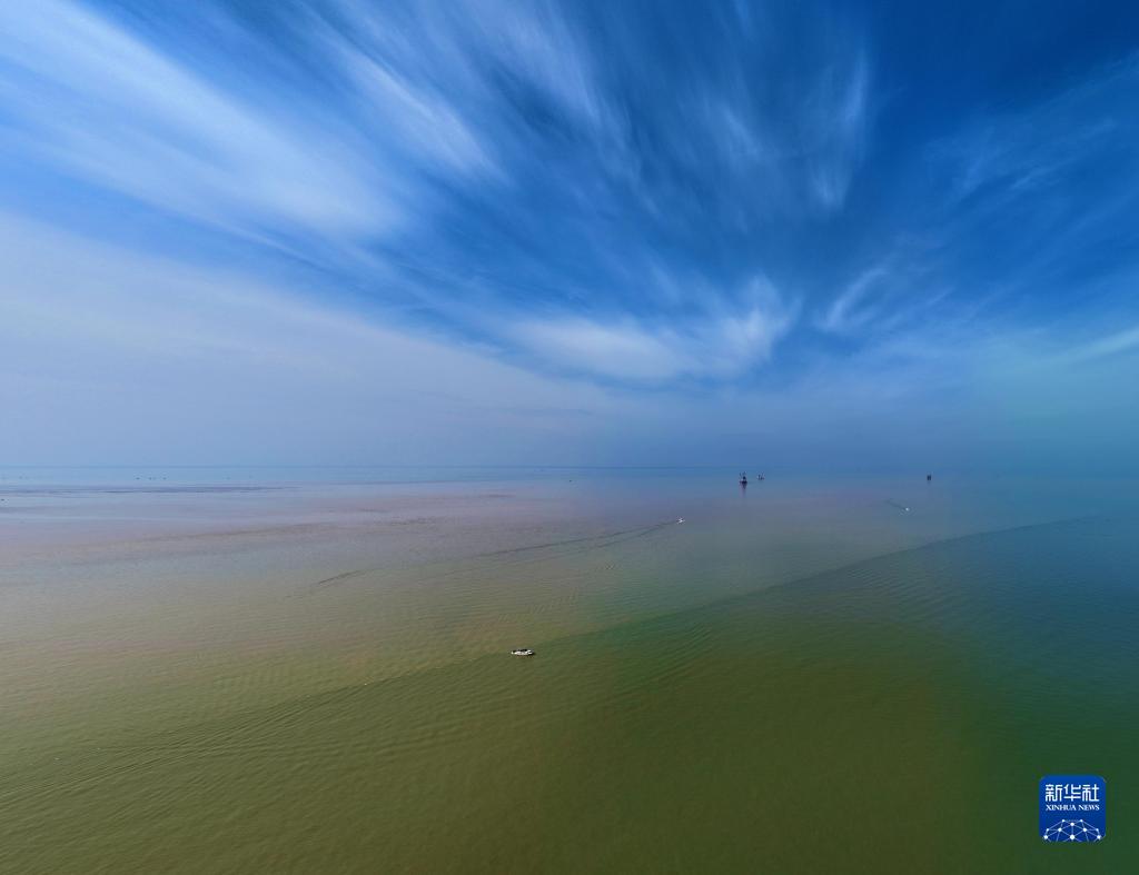 在山東省東營(yíng)市黃河入???,黃河匯入渤海。黃色的河水和藍色的海水之間形成了一條“分界線(xiàn)”,河黃海清,涇渭分明。