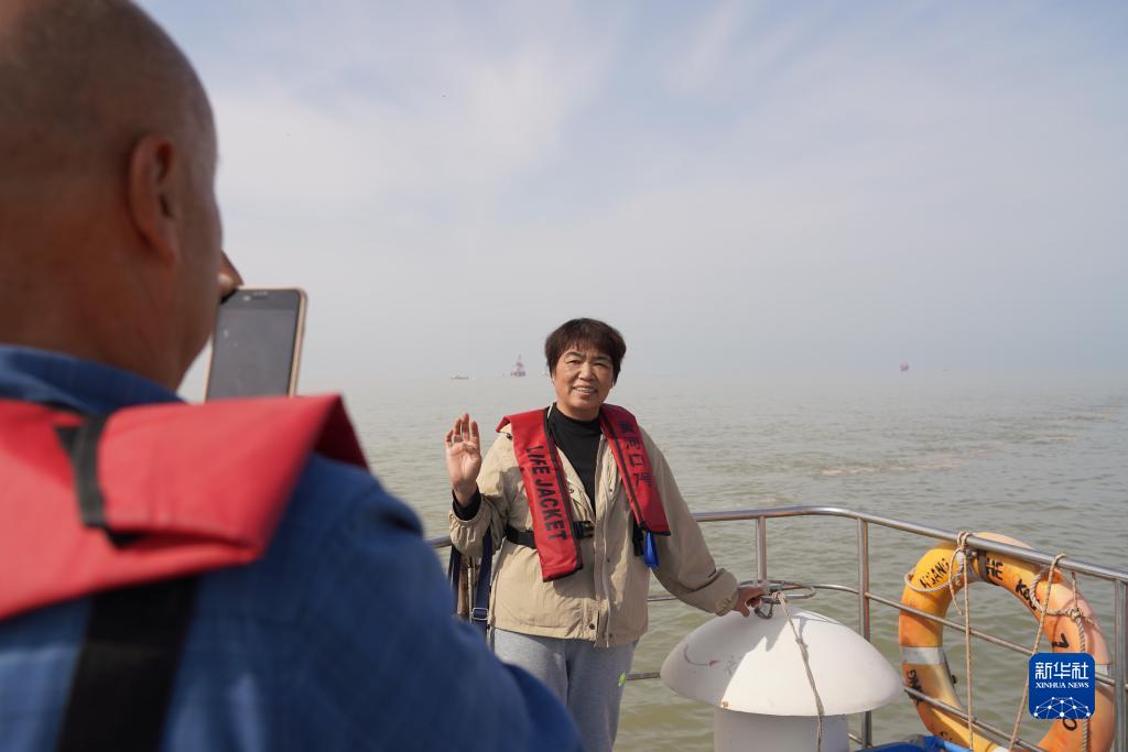 10月12日,在黃河入???,游客在船上拍照留念。