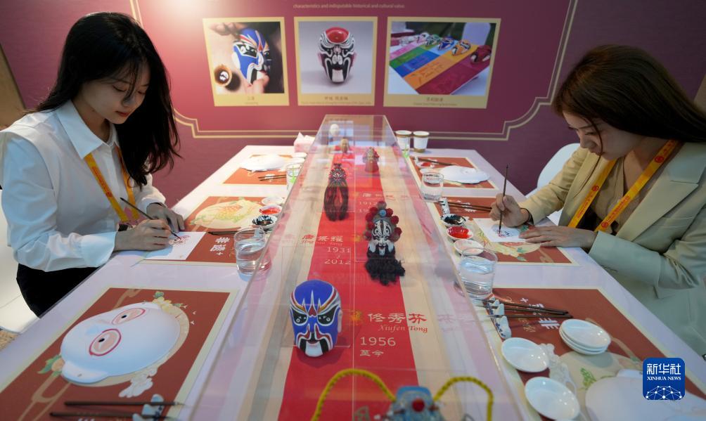 10月16日,在第三屆“一帶一路”國際合作高峰論壇新聞中心,媒體記者體驗在明信片上畫(huà)臉譜。