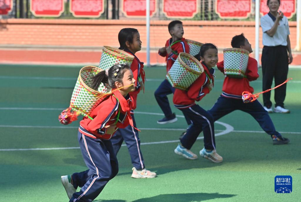 10月16日,在梧州市長(cháng)洲區龍平小學(xué),學(xué)生們在體育課上進(jìn)行拋繡球比賽。