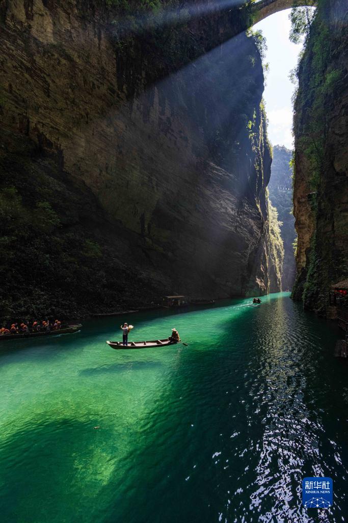 秋日,湖北省恩施土家族苗族自治州鶴峰縣容美鎮屏山村屏山旅游景區吸引眾多游客。屏山旅游景區河水清澈見(jiàn)底,舟行水上如懸浮空中,美如畫(huà)卷。