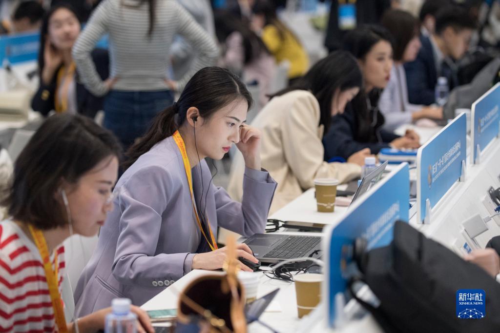 10月17日,記者在“一帶一路”國際合作高峰論壇新聞中心工作。