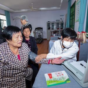 10月17日,志愿者(右)在東白湖鎮樂(lè )齡中心給老人們測量血壓。