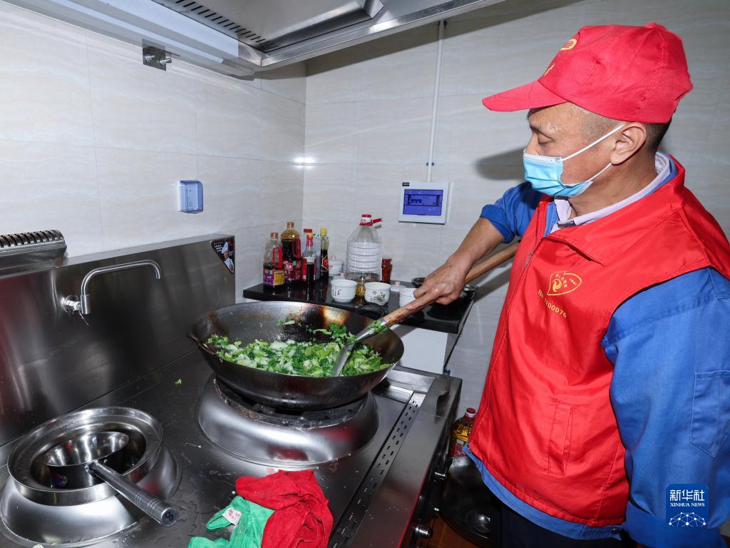 10月17日,愛(ài)心廚師在東白湖鎮樂(lè )齡中心愛(ài)心食堂的廚房?jì)冉o老人們烹飪午餐。