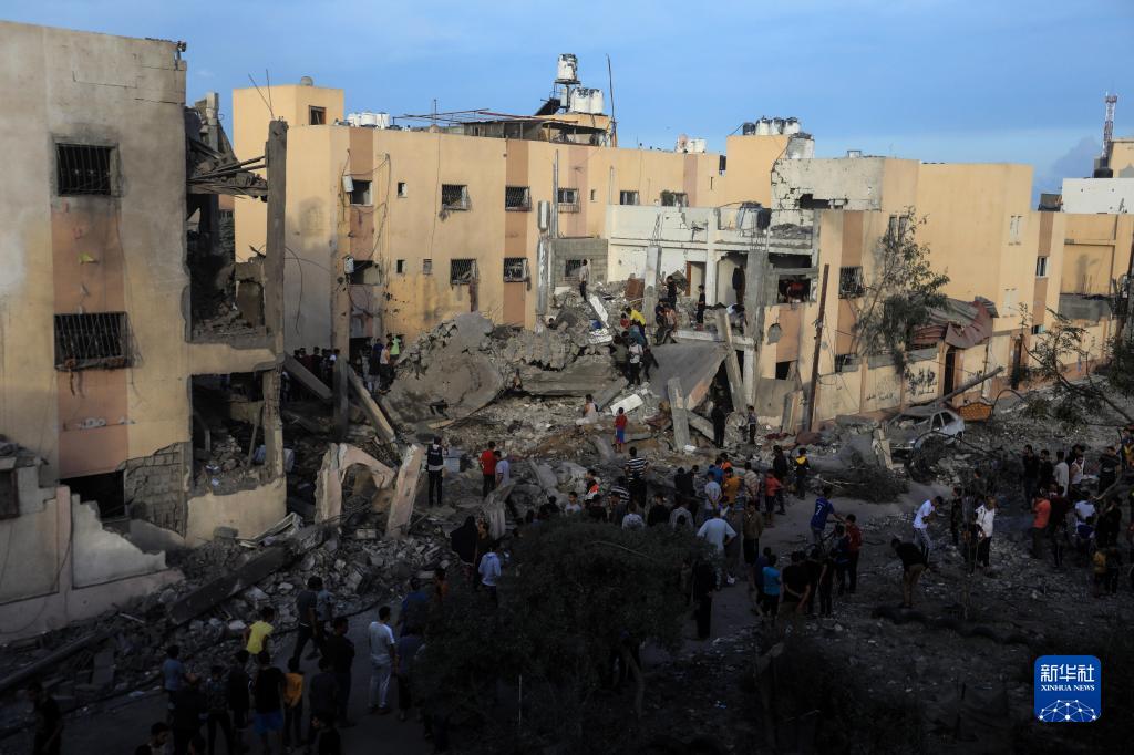 10月17日,在加沙地帶南部城市汗尤尼斯,人們在遭以色列襲擊損毀的建筑中實(shí)施救援。