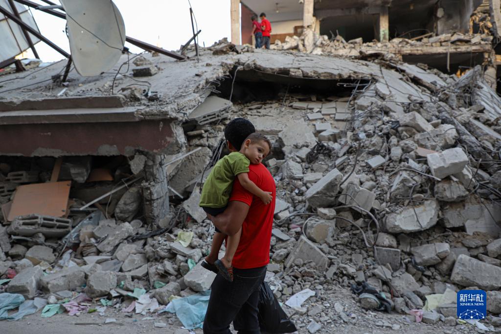 10月16日,在加沙地帶南部城市汗尤尼斯,人們從遭以色列空襲損毀的建筑廢墟前走過(guò)。