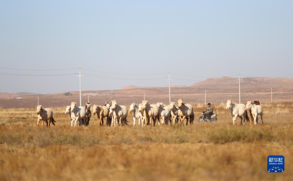 金秋時(shí)節,天氣轉涼,鄂爾多斯草原上一片金黃。牧民道爾吉騎著(zhù)摩托車(chē)在草原上驅趕馬群,開(kāi)始忙碌的一天。飲馬、趕羊是這個(gè)季節每天的工作。