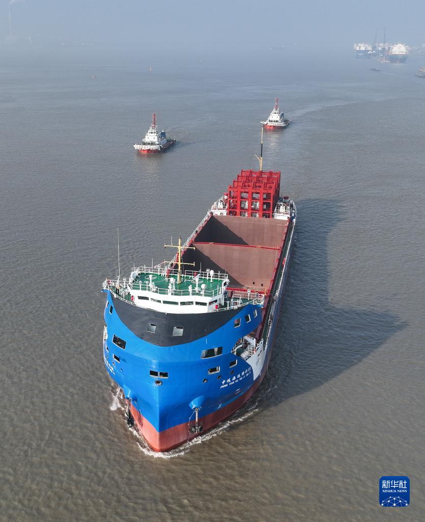 10月18日,中遠海運萬(wàn)噸級電動(dòng)集裝箱船在長(cháng)江試航(無(wú)人機照片)。