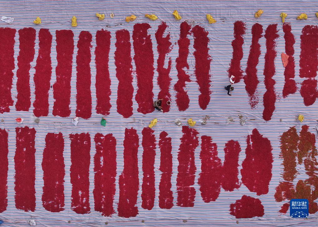 10月18日,河北省唐山市遷西縣羅家屯鎮西寨村農民在整理辣椒(無(wú)人機照片)。