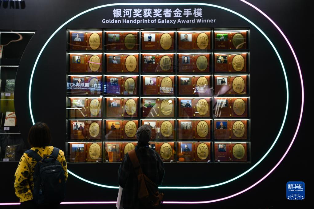10月18日,觀(guān)眾在2023成都世界科幻大會(huì )主題展覽上觀(guān)看歷屆銀河獎獲獎?wù)呓鹗帜!?/p>