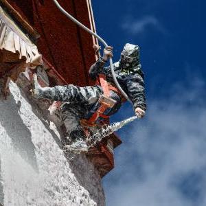 工作人員對布達拉宮外墻噴灑涂料(10月18日攝)。