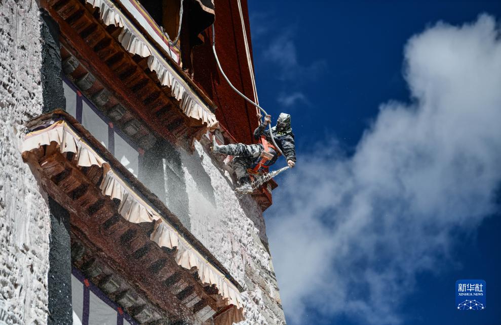 工作人員對布達拉宮外墻噴灑涂料(10月18日攝)。