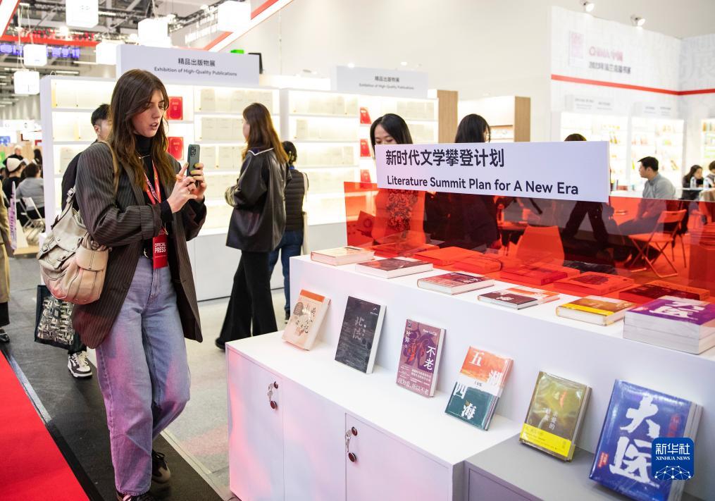 10月19日,一名參觀(guān)者在德國法蘭克福書(shū)展中國展區拍攝圖書(shū)。