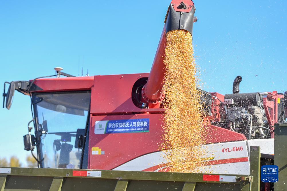 10月19日,在中國科學(xué)院“黑土糧倉”科技會(huì )戰長(cháng)春示范區公主嶺示范基地,無(wú)人駕駛農機將收獲的玉米放入拖拉機。