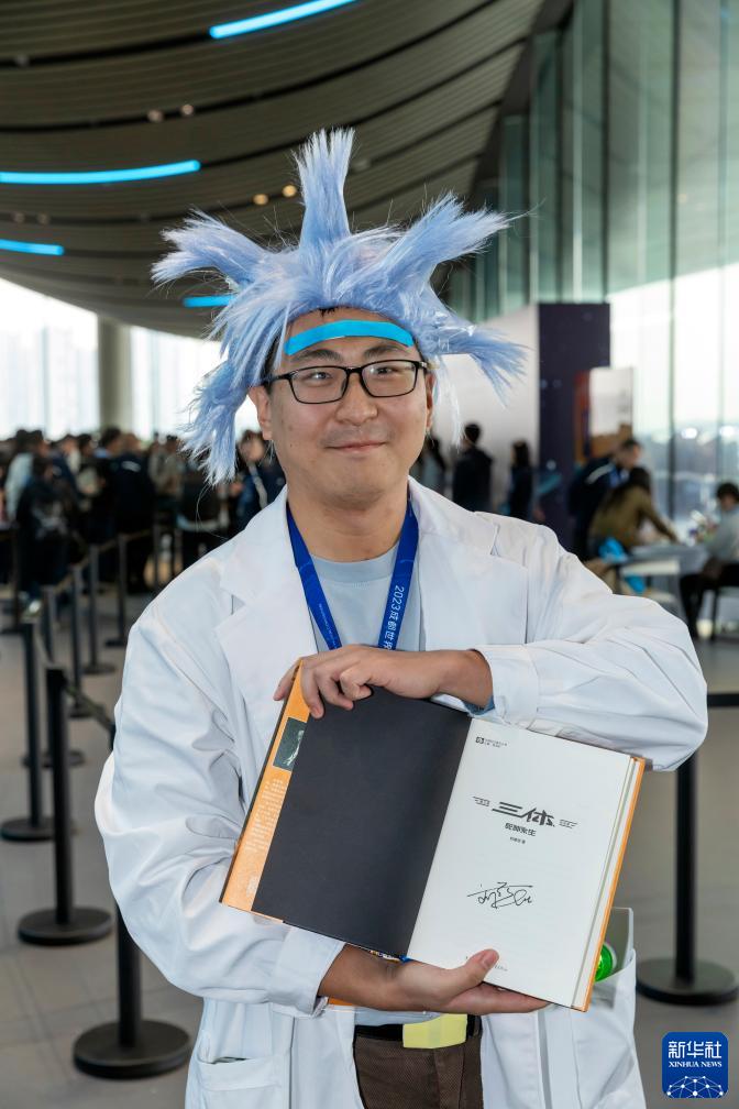 10月20日,一名來(lái)自西安的科幻迷展示劉慈欣在《三體》上的簽名。
