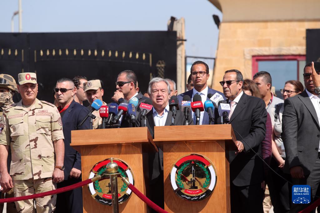 10月20日,在拉法口岸埃及一側,聯(lián)合國秘書(shū)長(cháng)古特雷斯(中)發(fā)表講話(huà)。新華社發(fā)(艾哈邁德·戈馬攝)