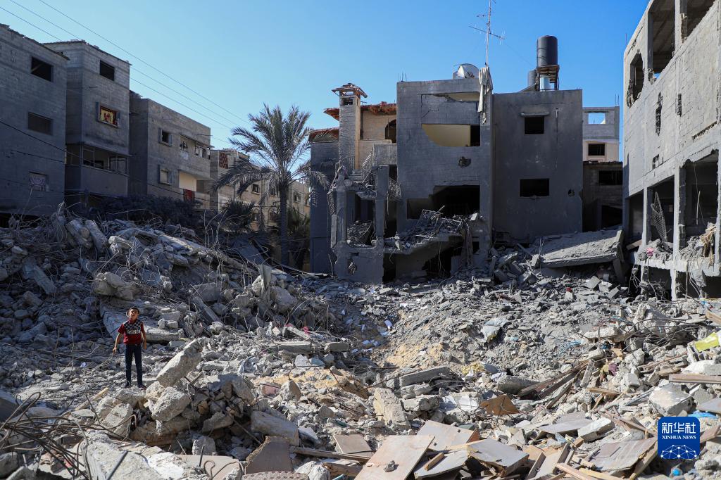 10月20日,在加沙地帶南部城市汗尤尼斯,男孩站在遭以色列襲擊損毀的建筑中。