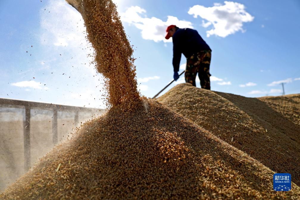 10月20日,一名工人在盤(pán)錦市遼河三角洲尤巧元家庭農場(chǎng)的貨車(chē)里整理剛剛收割裝運的水稻。