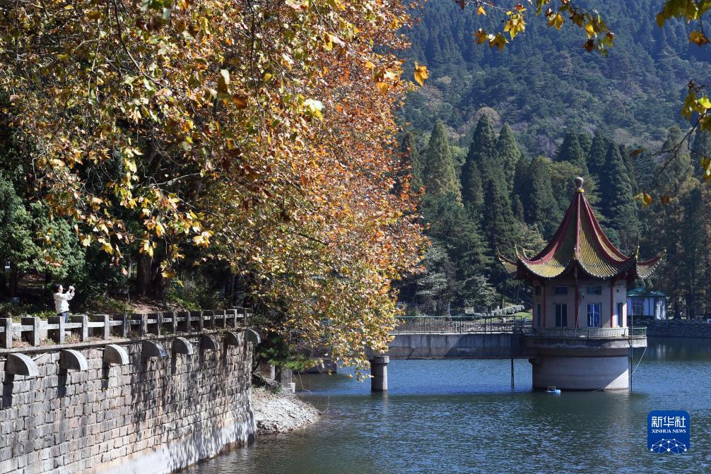 10月21日,游客在廬山蘆林湖畔拍照。
