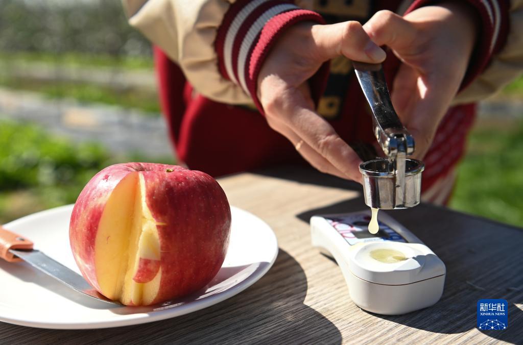10月20日,西北農林科技大學(xué)科研人員在洛川蘋(píng)果試驗站檢測蘋(píng)果品質(zhì)。