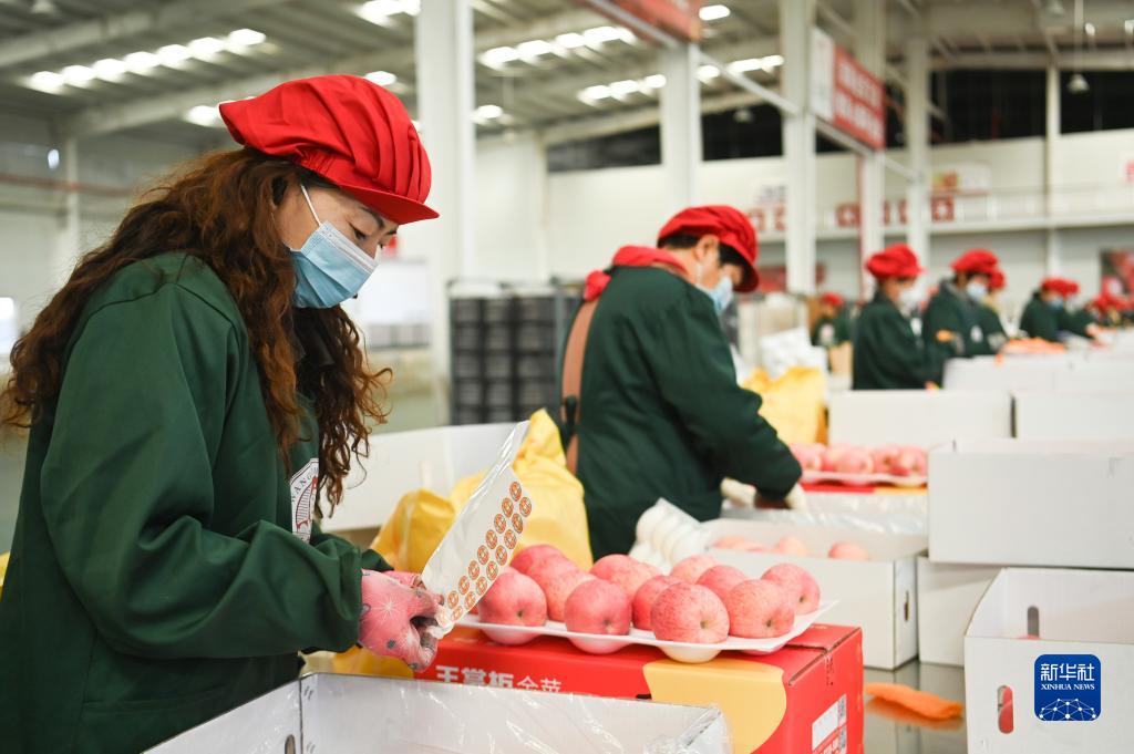 10月20日,工作人員在延安市洛川縣一家果業(yè)企業(yè)為蘋(píng)果貼標。