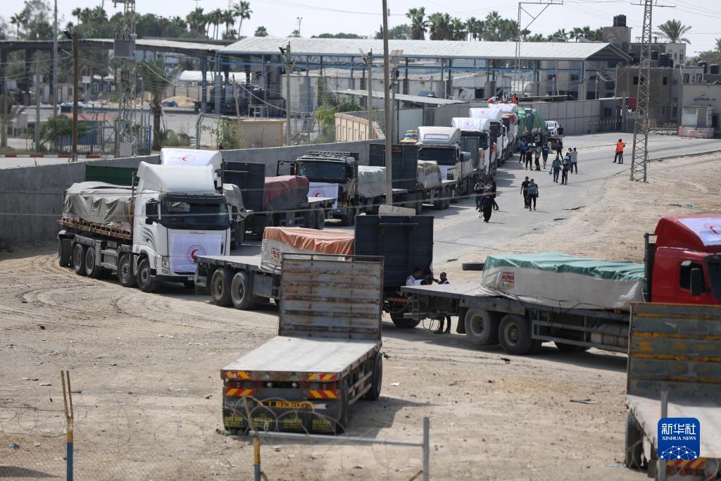 10月21日,裝載有人道援助物資的貨車(chē)通過(guò)拉法口岸進(jìn)入加沙地帶。