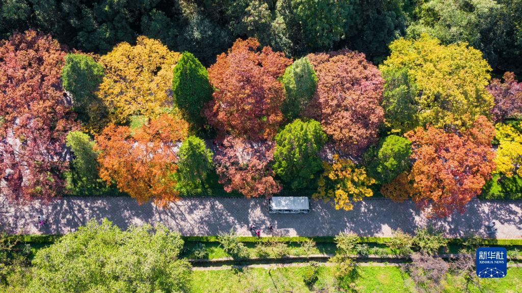 10月21日拍攝的南京明孝陵景區石象路秋景(無(wú)人機照片)。